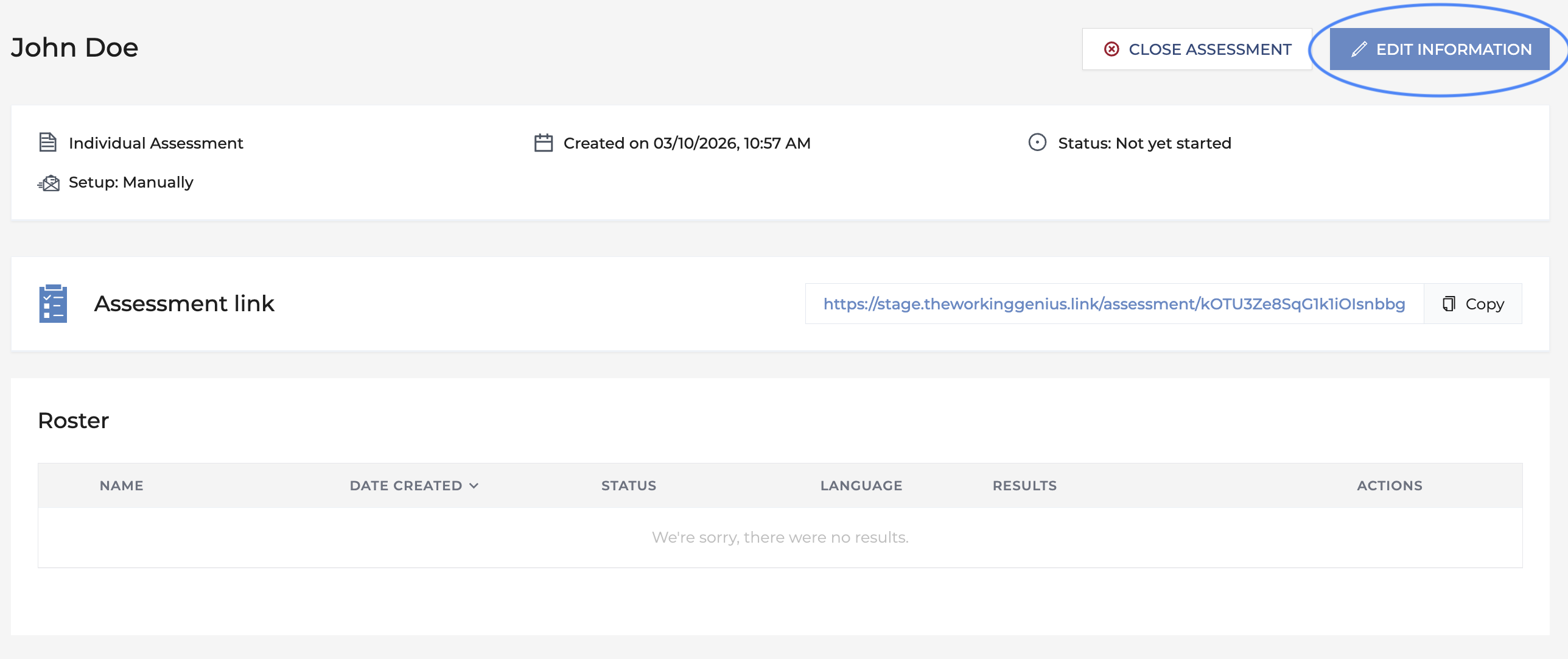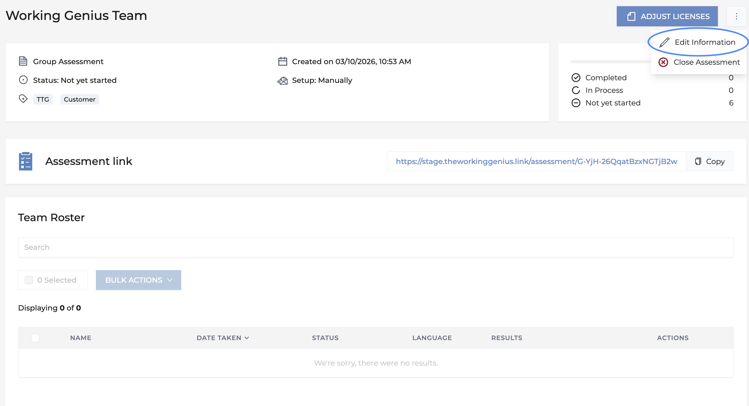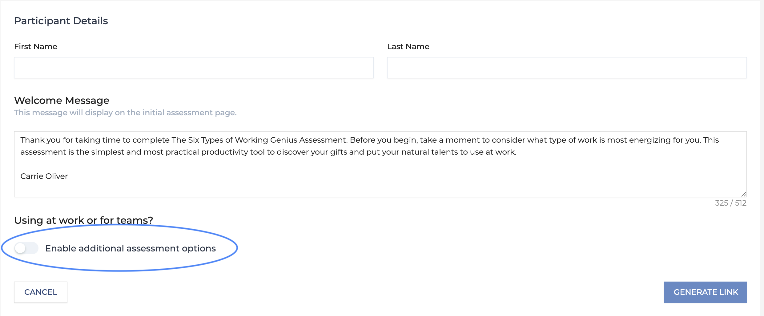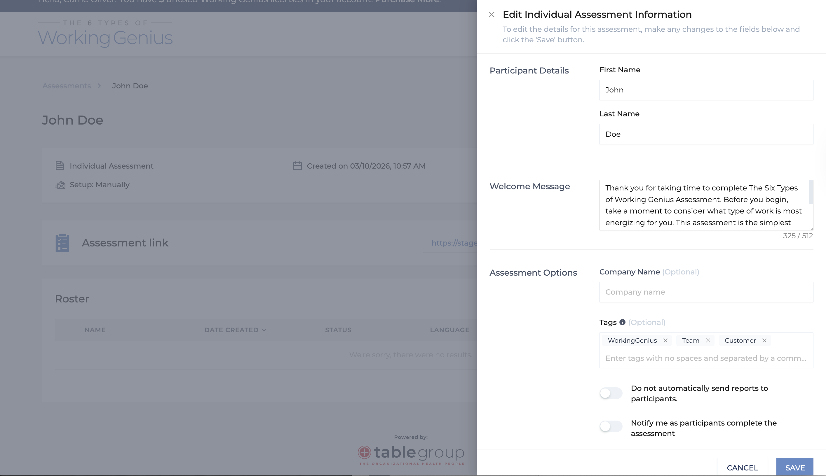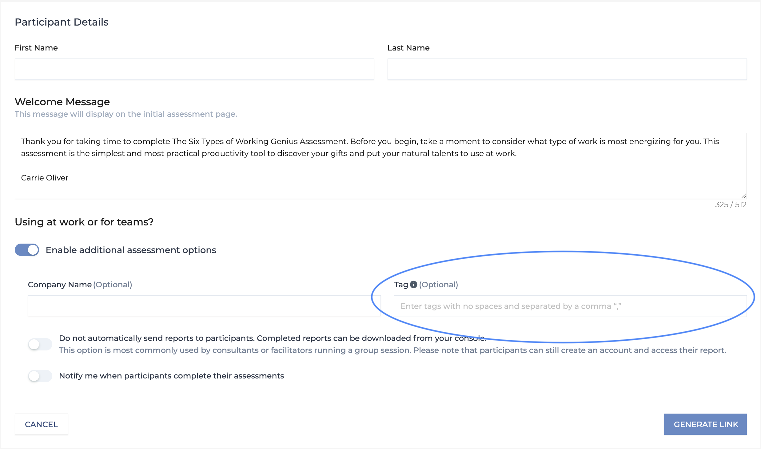 When creating (or editing) a Working Genius Assessment, you have the ability to use tags to further organize and sort your individuals and groups. For example, you can add a department tag, such as marketing, for all the individuals and teams you created assessment links for that are part of the marketing department at your company.