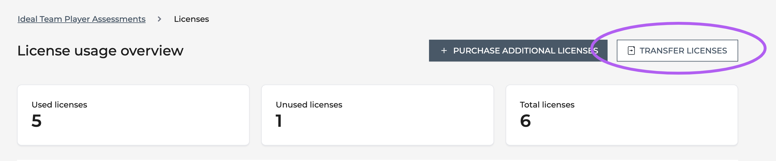 If someone has purchased Ideal Team Player assessment licenses and they are not assigned to an individual or group link, the user can transfer those unused licenses to another user.